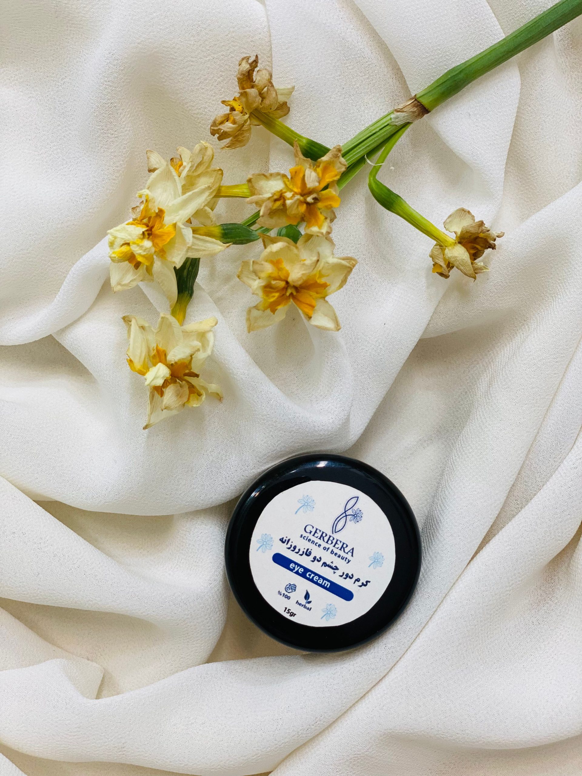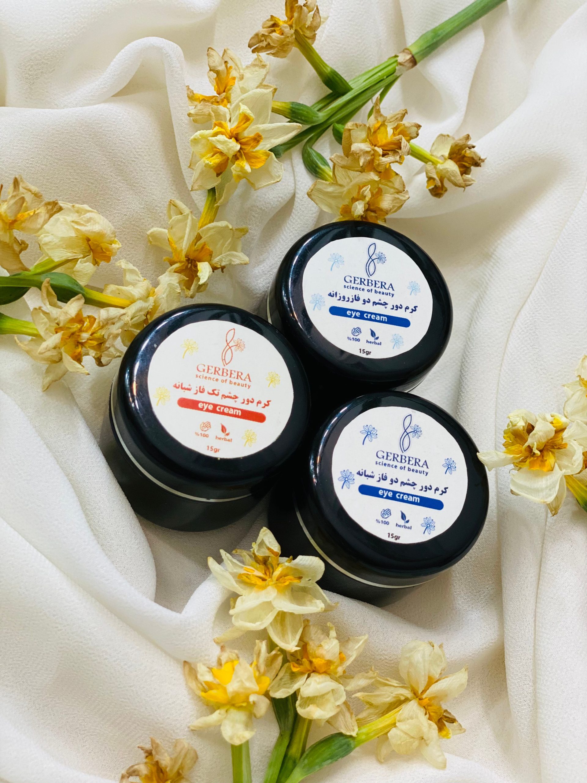 کرم دور چشم ژربرا حاوی:عرقیات کاسنی.کاهو.بهارنارنج.خیار.گلاب و… و روغن های:نارگیل. آرگان.گردو.جوجوبا.سیب زمینی.گل سرخ.خیار و بذر خیارو…