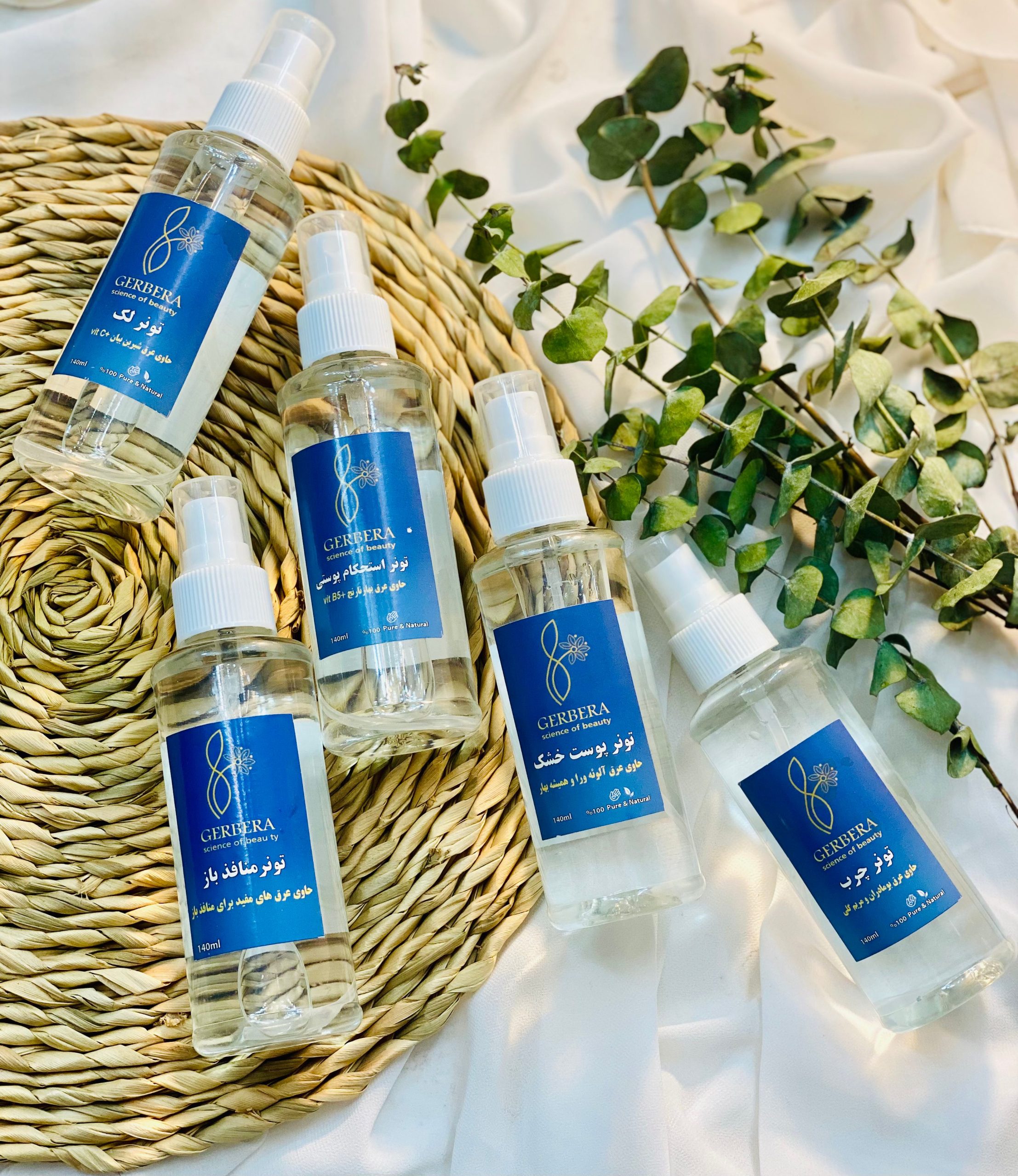 تونر پوست خشک، ژربرا، آبرسان گیاهی، تنظیم PH پوست، عرقیات گیاهی، مراقبت پوست خشک، تونر طبیعی